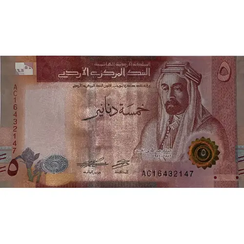المملكة الأردنية الهاشمية البنك المركزي الأردني ورقة نقد صادرة بموجب قانون البنك المركزي الأردني خمسَة دنانير الملك عبرالله بن الحسين ١٨٨٣-١٩٥١ المحافظ - وزير المالية (Translation: The Hashemite Kingdom of Jordan Central Bank of Jordan A banknote issued according to the law of the Central Bank of Jordan Five Dinars King Abdullah I Ibn Hussain 1853-1931 Governor - Minister of Finance) |