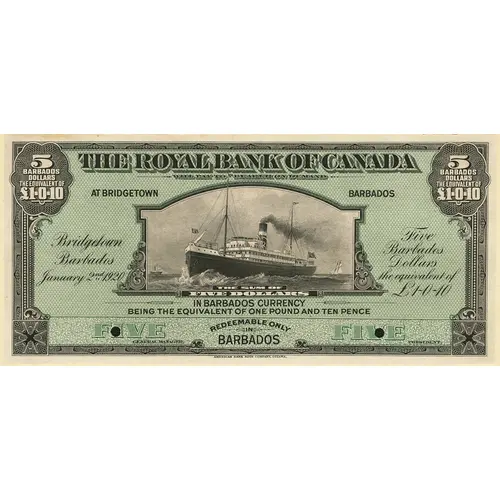 THE ROYAL BANK OF CANADA WILL PAY TO BEARER ON DEMAND AT BRIDGETOWN BARBADOS THE SUM OF FIVE DOLLARS IN BARBADOS CURRENCY BEING THE EQUIVALENT OF ONE POUND AND TEN PENCE REDEAMABLE ONLY IN BARBADOS Bridgetown Barbados January 2nd, 1920 Five Barbados Dollars the equivalent of £ 1-0-10 FIVE GENERAL MANAGER PRESIDENT AMERICAN BANK NOTE COMPANY, OTTAWA |