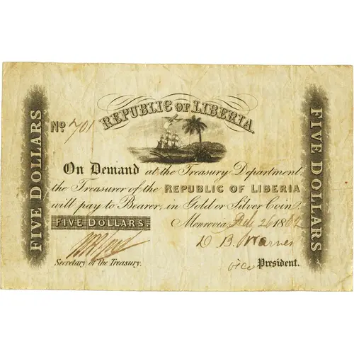 | Obverse lettering | REPUBLIC OF LIBERIA ON DEMAND AT THE TREASURY DEPARTMENT THE TREASURER OF THE REPUBLIC OF LIBERIA WILL PAY TO BEARER IN GOLD OR SILVER COIN FIVE DOLLARS |