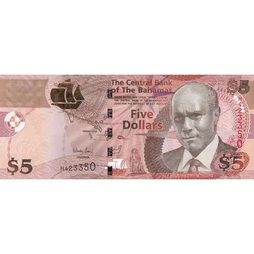 The Central Bank of The Bahamas THESE NOTES ARE LEGAL TENDER UNDER THE CENTRAL BANK OF THE BAHAMAS ACT 2000 FOR THE PAYMENT OF ANY AMOUNT Five Dollars SERIES 2013 GOVERNOR SIR CECIL WALLACE-WITHFIELD $5 |