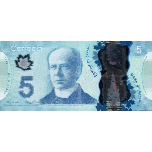 نوشته‌های روی اسکناس CANADA FIVE • CINQ DOLLARS BANQUE DU CANADA 5 BANK OF CANADA 5 ISSUE / ÉMISSION 2013 CE BILLET A COURS LÉGAL / THIS NOTE IS LEGAL TENDER OTTAWA SIR WILFRID LAURIER PRIME MINISTER / PREMIER MINISTRE 1896-1911