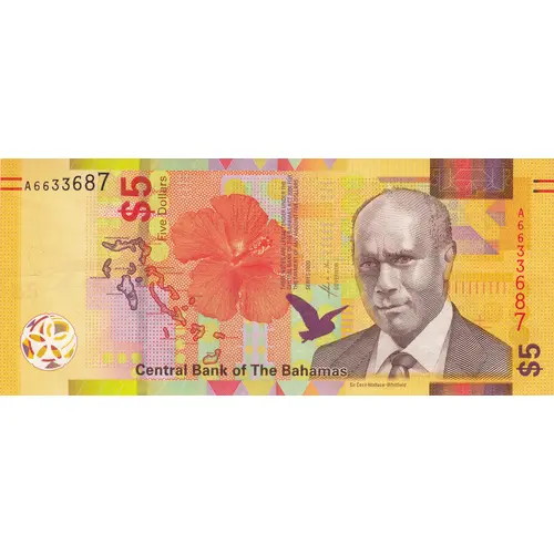 Central Bank of the Bahamas THESE NOTES ARE LEGAL TENDER UNDER THE CENTRAL BANK OF THE BAHAMAS ACT 2000 FOR THE PAYMENT OF ANY AMOUNT FIVE DOLLARS SERIES 2020 GOVERNOR Five Dollars $5 Sir Cecil Wallace-Whitfield |