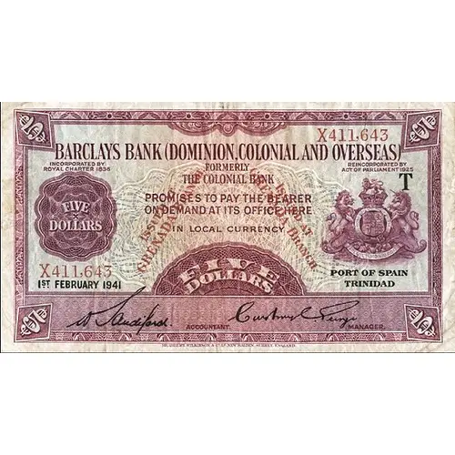 BARCLAYS BANK (DOMINION, COLONIAL AND OVERSEAS) INCORPORATED BY ROYAL CHARTER 1836 REINCORPORATED BY ACT OF PARLIAMENT 1925 FORMERLY THE COLONIAL BANK PROMISE TO PAY THE BARER ON DEMAND AT ITS OFFICE HERE FIVE DOLLARS IN LOCAL CURRENCY ISSUED AT GRENADA BRANCH ISSUED AT GRENADA BRANCH FIVE DOLLARS PORT OF SPAIN TRINIDAD |