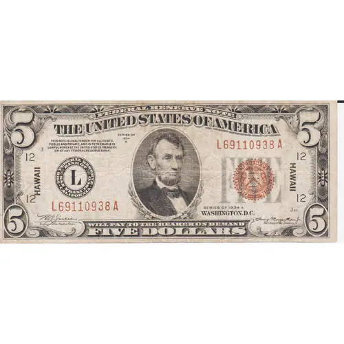Black print with brown serial numbers. Portrait of Abraham Lincoln at center. Treasurer`s signature and Federal Reserve Bank Seal at left. Secretary`s signature and Treasury Seal to right. Small HAWAII overprint on the far left and right. |