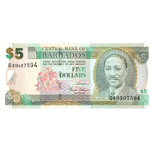 CENTRAL BANK OF BARBADOS THESE NOTES ARE LEGAL TENDER FOR THE PAYMENT OF ANY AMOUNT FIVE DOLLARS GOVERNOR SIR FRANK WORELL PRIDE AND INDUSTRY $5 1 MAY 2007 |