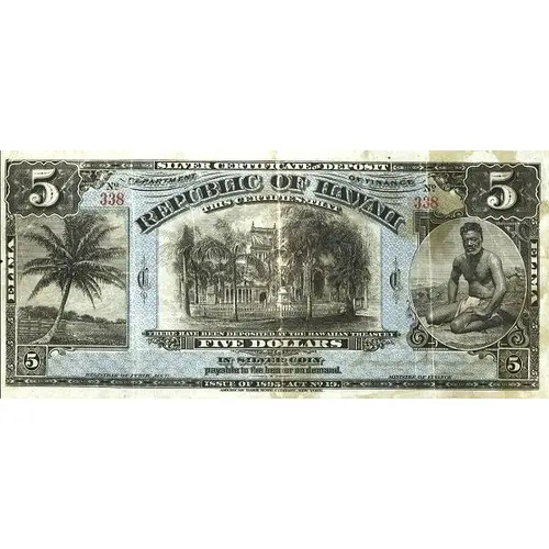 Leyenda del anverso SILVER CERTIFICATE OF DEPOSIT ELIMA DEPARTMENT OF FINANCE REPUBLIC OF HAWAII THIS CERTIFIES, THAT THERE HAVE BEEN DEPOSITED AT THE HAWAIIAN TREASURY FIVE DOLLARS IN SILVER COIN payable to the bearer on demand. ISSUE OF 1895 - ACT № 19