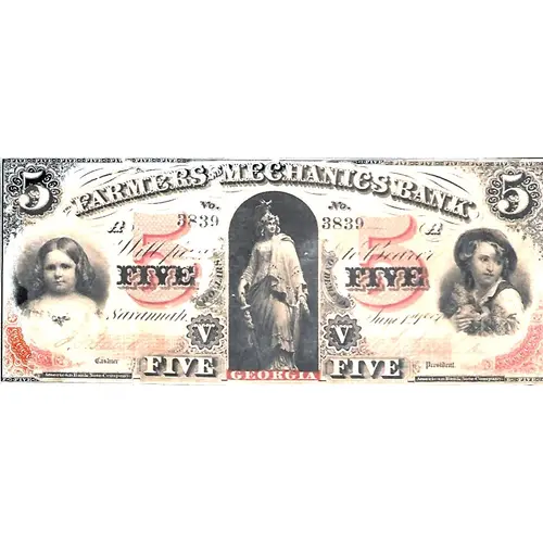 | Chữ khắc mặt trước | THE FARMERS AND MECHANICS BANK Will pay to Bearer FIVE DOLLARS ON DEMAND Savannah, June 1st, 1860 FIVE GEORGIA |