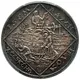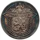 Saint driving plow drawn by Devil left; Medieval miner ascending from ground by ladder, holding oil lamp; barren tree and machinery on either side; all within beaded square; meaning of the lettering: `I`m struck of Czech metal` |