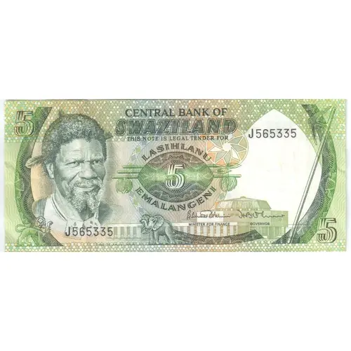 (Translation: Central Bank of Swaziland This note is legal tender for Five 5 Emalangeni)