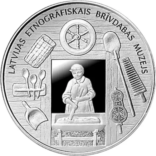Описание аверса In the centre – a woman mixing dough in a bread trough with a mixing paddle. Above the image – a spinning wheel, with the inscription `LATVIJAS ETNOGRĀFISKAIS BRĪVDABAS MUZEJS` (The Ethnographic Open-air Museum of Latvia) at the top, arranged in a semicircle. On both sides of the image – historic tools and household objects: on the left (from the top): a fish basket, a spoon board with spoons, a flour scoop, on the right (from left to right): a distaff, a bread-shovel and a washboard.
