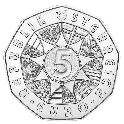 The obverse of the coin shows the coats of arms of the nine federal states of Austria, as do all Austrian 5 euro coins. |