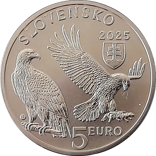 The obverse depicts, to the left, an eastern imperial eagle perched on a branch and, to the right, an eagle in flight with wings outstretched. The Slovak coat of arms appears in the upper right of the design, directly below the year of issuance ‘2025’. Inscribed along the upper edge is the name of the issuing country ‘SLOVENSKO’. The coin’s denomination and currency, ‘5 EURO’, are positioned in the lower right, below the flying eagle. To the left of the perched eagle is the mint mark of the Kremnica Mint (Mincovňa Kremnica), consisting of the letters ‘MK’ between two dies. |