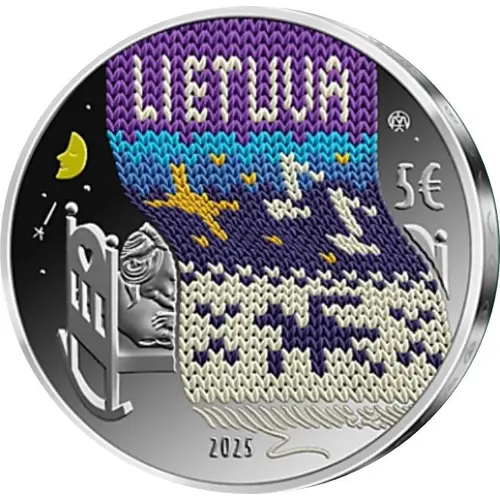 | Obverse description | The obverse of the coin depicts an item of needlework, which features the inscription “LIETUVA” (Lithuania) and a symbolic silhouette of the Vytis, enwrapping a sleeping child like a blanket. The background images create the composition of a cosy evening, including stars and the moon, as well as the denomination (€1.50), the mintmark of the Lithuanian Mint, and the year of issue (2025). |