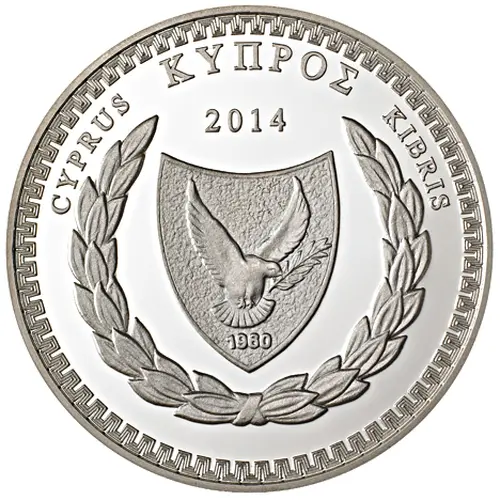 Τhe emblem of the Central Bank of Cyprus , the words «ΚΥΠΡΟΣ», «CYPRUS» and «KIBRIS» and the year «2014». |