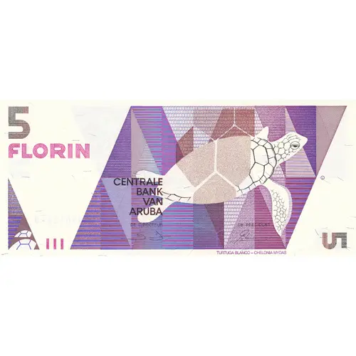 | 表面の銘文 | 5 FLORIN CENTRALE BANK VAN ARUBA TURTUGA BLANCO - CHELONIA MIDAS (Translation: 5 Florin Central Bank of Aruba White Turtle ((Chelonia Midas)) |