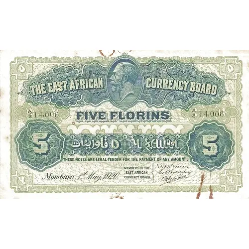 | Vorderseitenlegende | THE EAST AFRICAN CURRENCY BOARD FIVE FLORINS THESE NOTES ARE LEGAL TENDER FOR THE PAYMENT OF ANY AMOUNT |