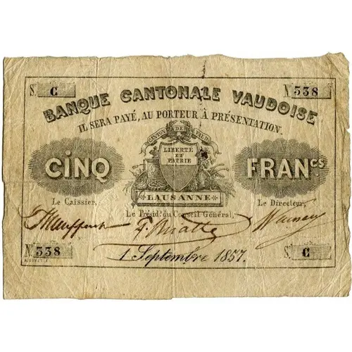 | Obverse lettering | BANQUE CANTONALE VAUDOISE IL SERA PAYÉ AU PORTEUR À PRÉSENTATION CANTON DE VAUD LIBERTÉ ET PATRIE LAUSANNE CINQ FRANcs Le Caissier, Le Présdi. du Conseil Général, Le Directeur, 1 Septembre 1857. |