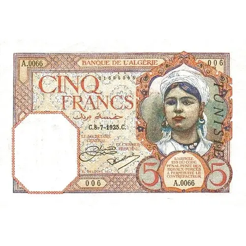 | Vorderseitenlegende | BANQUE DE L`ALGERIE CINQ FRANCS LE SECRETAIRE GENERAL LA CAISSIER PRINCIPAL 5 L`article 139 du code pénal punit des travaux forcés à perpétuité le contrefacteur 5 E. DELOCHE SC. TUNISIE |