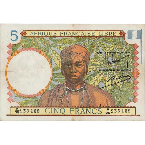Obverse lettering 5 | AFRIQUE FRANÇAISE LIBRE POUR LE CONSEIL DE DÉFENSE LE DIRECTEUR FINANCIER CINQ FRANCS
