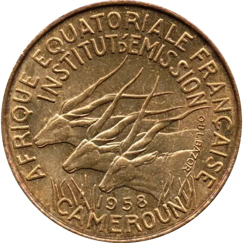 | Legenda do anverso | AFRIQUE EQUATORIALE FRANCAISE INSTITUT D`EMISSION G.B.L.BAZOR 1958 CAMEROUN (Translation: French Equatorial Africa Currency institute G.B.L.Bazor 1958 Cameroon) |