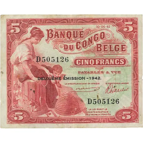 | Opis líce | BANQUE DU CONGO BELGE CINQ FRANCS PAYABLES A VUE LA LOI PUNIT LE CONTREFACTEUR AUX TRAVAUX FORCES |