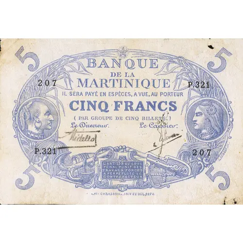 | Legenda del dritto | BANQUE DE LA MARTINIQUE IL SERÁ PAYÉ EN ESPÈCES, A VUE, AU PORTEUR CINQ FRANCS (PAR GROUPE DE CINQ BILLETS.) Le Directeur Le Caissier L`ART 139 DU CODE PÉNAL PUNIT DES TRAVAUX FORCÉS A PERPEÉTUITÉ LE CONTRFACTEUR AH - CABASSON . INV ET DEL 1874 J. ROBERT SC. (Translation: Bank of Martinique will pay in cash to bearer Five Francs (per group of five tickets) Article 129 of the Penal Code finishes forced labor in perpetuity for the counterfeiter.) |