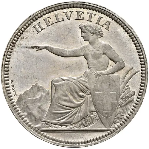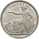| Descrizione del dritto | Helvetia seated, facing left, wearing laurel wreath and toga, with right arm raised and holding shield with coat of arms of Switzerland in left hand. Plow and wheat spikes to the right. Mountains to the left. |