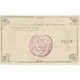 La légende dans un cadre aux motifs floraux. Cachet communal à l`encre mauve et numéro de série en noir à droite au milieu. Cachet `ANNULE` en noir, verticalement à droite. |