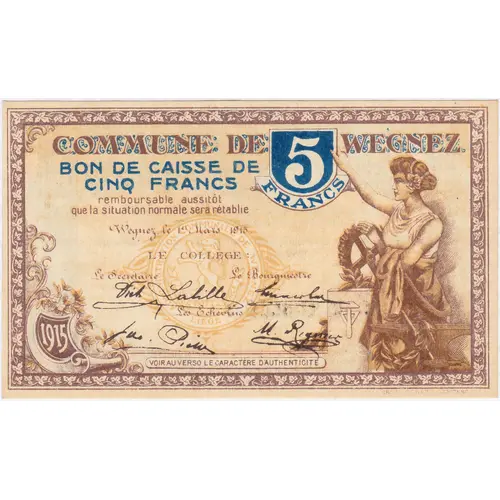 COMMUNE DE WEGNEZ BON DE CAISSE DE CINQ FRANCS remboursable aussitôt que la situation normale sera rétablie Wegnez, le 1er Mars 1915. LE COLLÈGE : Le Secrétaire Le Bourgemestre (signature) (signature) Les Echevins (signature) (signature) VOIR AU VERSO LE CARACTÈRE D’AUTHENTICITÉ |