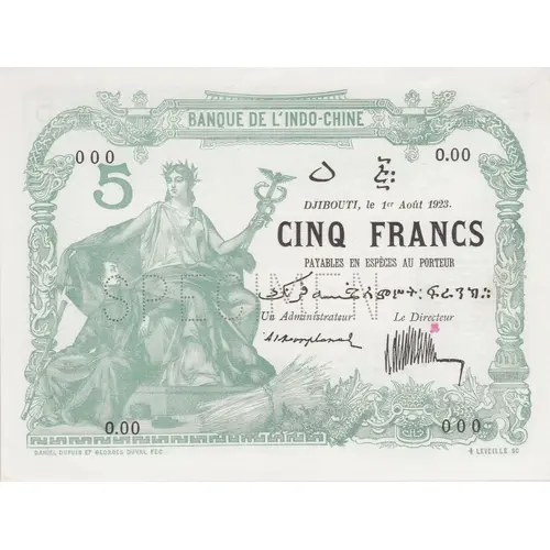 | Надписи лицевой стороны | BANQUE DE L`INDO-CHINE ۵ ፭ DJIBOUTI, le 1er Août 1923. CINQ FRANCS خمسة فرنك አምስት ፍራንክ PAYABLES EN ESPÈCES AU PORTEUR Un Administrateur Le Directeur 5 DANIEL DUPUIS ET GEORGES DUVAL FEC A LEVEILLE SC (Translation: Bank of Indochina. 5. Djibouti, August 1st., 1923. Five francs. Payable in cash to bearer. An administrator, the director.) |