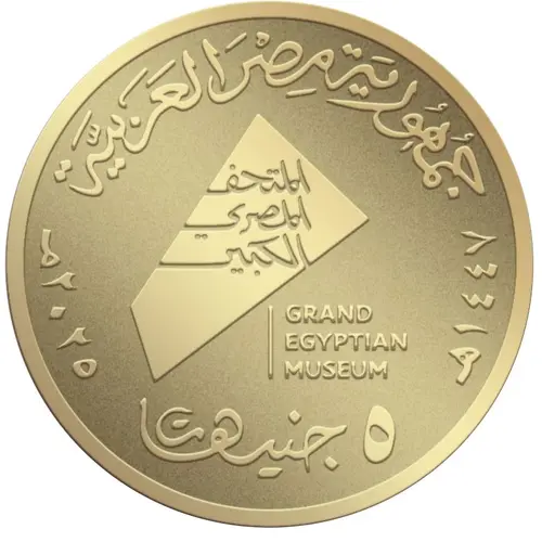 | Legenda awersu | جمهورية مصر العربية المتحف المصرى الكبير GRAND EGYPTIAN MUSEUM ١٤٤٧ هـ ٢٠٢٥ م ٥ جنيهات (Translation: Arab Republic of Egypt The Grand Egyptian Museum 2025 AD 1447 Hijri 5 Pounds) |