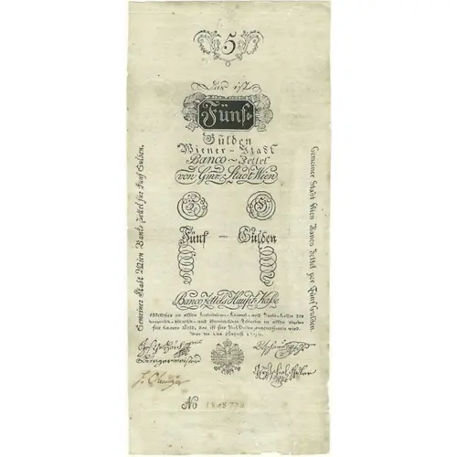 Obverse lettering 5 Das iſt Fünf Gũlden Wiener-Stadt Banco-Zettel