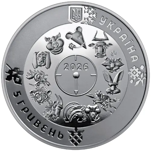 | Описание аверса | At the top – a small State Coat of Arms of Ukraine, to the right of which is the inscription УКРАЇНА in a semicircle; 12 symbols of the Eastern calendar are depicted in a circle on a mirror background, in the center of the circle - a stylized clock with an arrow pointing to a horse - a symbol of the year, above the arrow - 2026; at the bottom left, the inscription in a semicircle 5 ГРИВЕНЬ; on a matte background, the symbols of each season stylized as Ukrainian vytynanka are depicted: a snowflake (above), a flower (right), a berry (below), a leaf (left); logo of the Mint of the National Bank of Ukraine (on the right above the tiger symbol). |