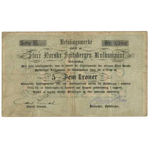 Betalingsmerke utstedt av Store Norske Spitsbergen Kulkompani Aktieselskap Mot dette betalingsmerke, som er utstedt for tilgodehavende løn, utleverer Store Norske Spitsbergen Kulkompani, til ihændehaveren varer for et -beløp av 5 - Fem kroner Ubenyttede betalingsmerker blir ved ihændehaverens avreise fra Spitsbergen i sæsonen 1922/23 at tilbakelevere til kontoret mot beløpets godskrivning i opgjøret. Merket er ugyldig utenfor Spitsbergen og efter sæsonens avslutning. Styrets formand. Kontordjef, Spitsbergen. (Translation: Payment note issued by The Great Norwegian Spitsbergen Coal Company Against this payment note, which is issued for outstanding wages, The Great Norwegian Spitsbergen Coal Company delivers to the bearer goods for an amount of 5 kroner Unused notes when the beares departs from Spitsbergen during the season 1922/23 is returned to the office against credit of the amount in the settlement. The note is invalid outside Spitsbergen and after the end of the season. Chairman of the board. Office manager, Spitsbergen.) |