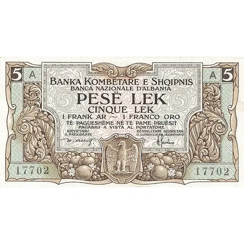 | Obverse lettering | BANKA KOMBËTARE E SHQIPNIS BANCA NAZIONALE D`ALBANIA PESË LEK CINQUE LEK 1 FRANK AR ~ 1 FRANCO ORO TË PAGUESHËME NË TË PAME PRUËSIT PAGABILI AL VISTA AL PORTATORE (Translation: National Bank of Albania Five Lek 1 Gold Franc Payable to the bearer) |