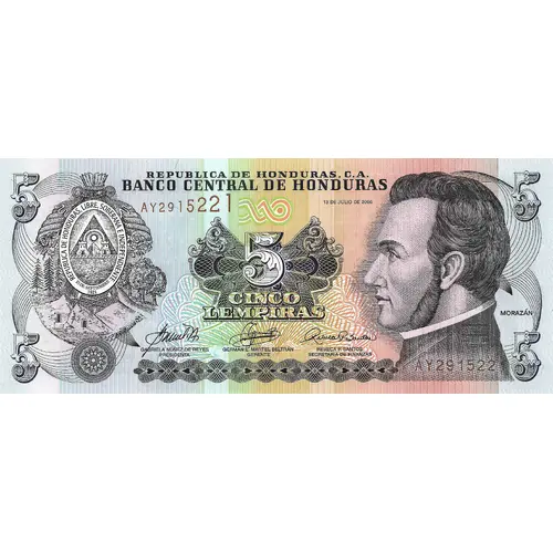 | Надписи оборотной стороны | 5 BANCO CENTRAL DE HONDURAS 5 BATALLA DE LA TRINIDAD NOVIEMBRE 11 DE 1827 CINCO LEMPIRAS 5 FRANCOIS CHARLES OBERTHUR (Translation: 5 CENTRAL BANK OF HONDURAS 5 BATTLE OF TRINIDAD NOVEMBER 11, 1827 FIVE LEMPIRAS 5 FRANCOIS CHARLES OBERTHUR) |