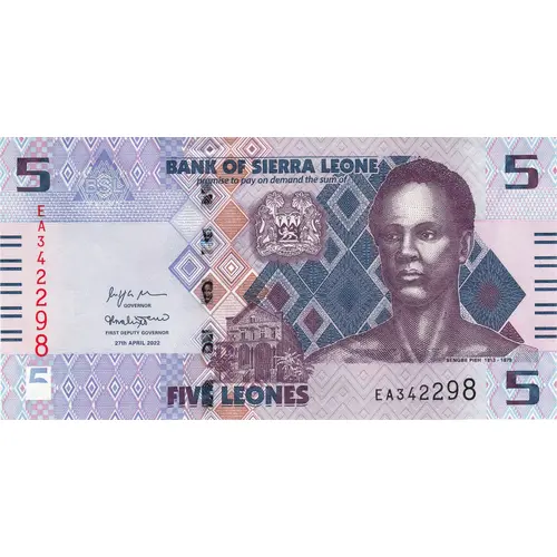 | Obverse lettering | 5 Bank of Sierra Leone 5 promise to pay on demand the sum of Five Leones 5 Sengbe Pieh 1813-1879 5 |