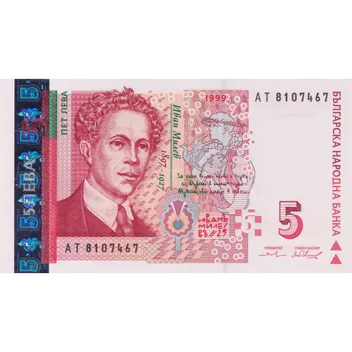 | Légende de l’avers | Българска Народна Банка Пет Лева Иван Милев 1897-1927 (Translation: Bulgarian National Bank Five Leva Ivan Milev 1897-1927) |