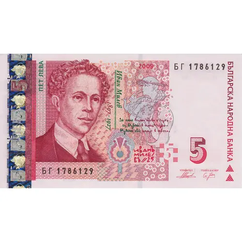 | توضیحات روی اسکناس | A portrait of Ivan Milev , a hologram stripe with alternating images of a flower, the figure “5” and the text “ЛЕВА” |