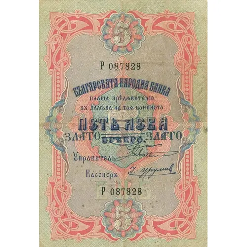 | Opschrift voorzijde | Петъ Лева Злато Срѣбро Злато Българската Народна Банка Плаща Прѣдѫвителю въ замѣна на таѫ банкнота (Translation: Five Leva Gold Silver Gold The Bulgarian National Bank Pays the Bearer for exchange of this banknote) |