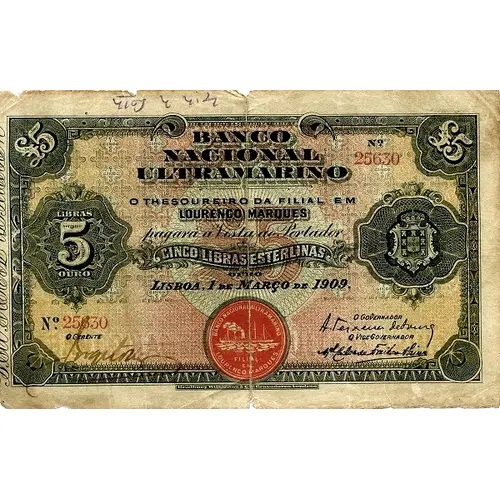 | Legenda do anverso | BANCO NACIONAL ULTRAMARINO O THESOUREIRO DA FILIALA EM LOURENÇO MARQUES PAGARÁ Á VISTA AO PORTADOR CINCO LIBRAS ESTERLINAS OURO |