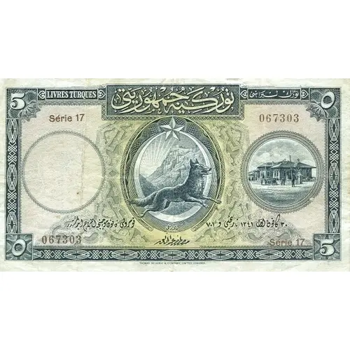 | Vorderseitenlegende | 5 LIVRES TURQUES ٥ تورُكَُ ليرَاسُٖى تُّورْكِيَّة جُمْهُورِيَّة (Translation: 5 Turkish Lira, Republic of Turkey) |