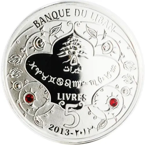 | Chữ khắc mặt trước | BANQUE DU LIBAN ٥ ليرات LIVRES 5 2013-٢٠١٣ (Translation: Bank of Lebanon 5 Livres 2013) |