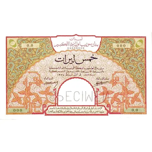 | نوشتههای پشت اسکناس | BANQUE DE SYRIE ET DU GRAND-LIBAN LIBAN CINQ LIVRES REMBOURSABLE AU PORTEUR EN CHÈQUE SUR PARIS OU MARSEILLE À RAISON DE VINGT FRANCS PAR LIVRE J. DEMARCQ FEC. HOURRIEZ SC. |