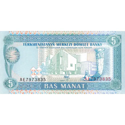 | Obverse lettering | TÜRKMENISTANYÑ MERKEZI DÖWLET BANKY $U BANKNOT TÖLEGLERIÑ ÄHLI GÖRNÜ$LERI ÜÇIN ҰÖREҰÄR BÄ$ MANAT (Translation: Central State Bank of Turkmenistan, This banknote is valid for all types of payments, Five Manat) |