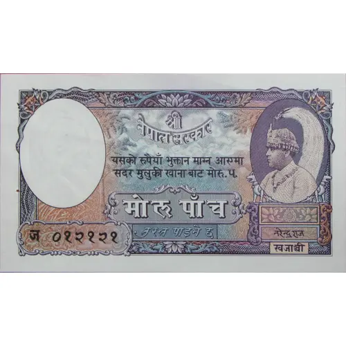 | Descrizione del dritto | Watermark Window - Portrait of King Tribhuwan in Watermark (L.), Himalayan Range (C.), Portrait of King Tribhuwan in Plumed Crown (R.) |