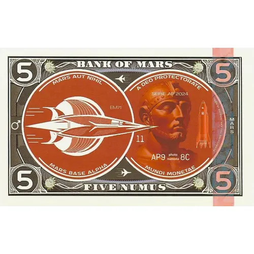 Obverse lettering 5 BANK OF MARS 5 MARS AUT NIHIL A DEO PROTECTORATE SERIE AP 2024 MARS EVERYTHING YOU CAN IMAGINE IS REAL MARS BASE ALPHA MUNDI MONETAE 5 FIVE NUMUS 5