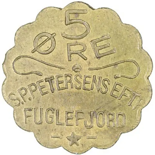 正面铭文 5 ØRE S. P. PETERSENS EPTF FUGLEFJORD