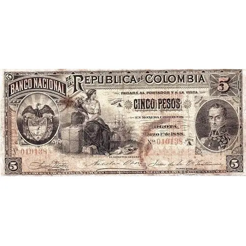| Obverse lettering | BANCO NACIONAL DE LA REPÚBLICA DE COLOMBIA PAGARÁ AL PORTADOR Y Á LA VISTA 5 PESOS EN MONEDA CORRIENTE BOGOTÁ Marzo 1º de 1888 (Translation: The National Bank of Colombia will pay to the bearer, and at sight 5 Pesos in currency Bogotá, March 1st., 1888) |