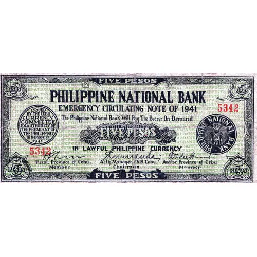 FIVE PESOS PHILIPPINE NATIONAL BANK CEBU CITY PHILIPPINES DECEMBER 29, 1941 EMERGENCY CIRCULATING NOTE OF 1941 FIVE PESOS |